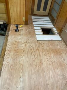 床材撤去、根太垂木補強、断熱材充填、構造用合板t12張り